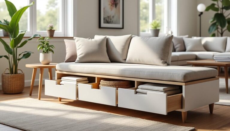 Retrouve mes conseils pour maîtriser ton rangement et meubler sans tout charger, ou encore exploite l’idée pratique derrière la banquette de rangement.